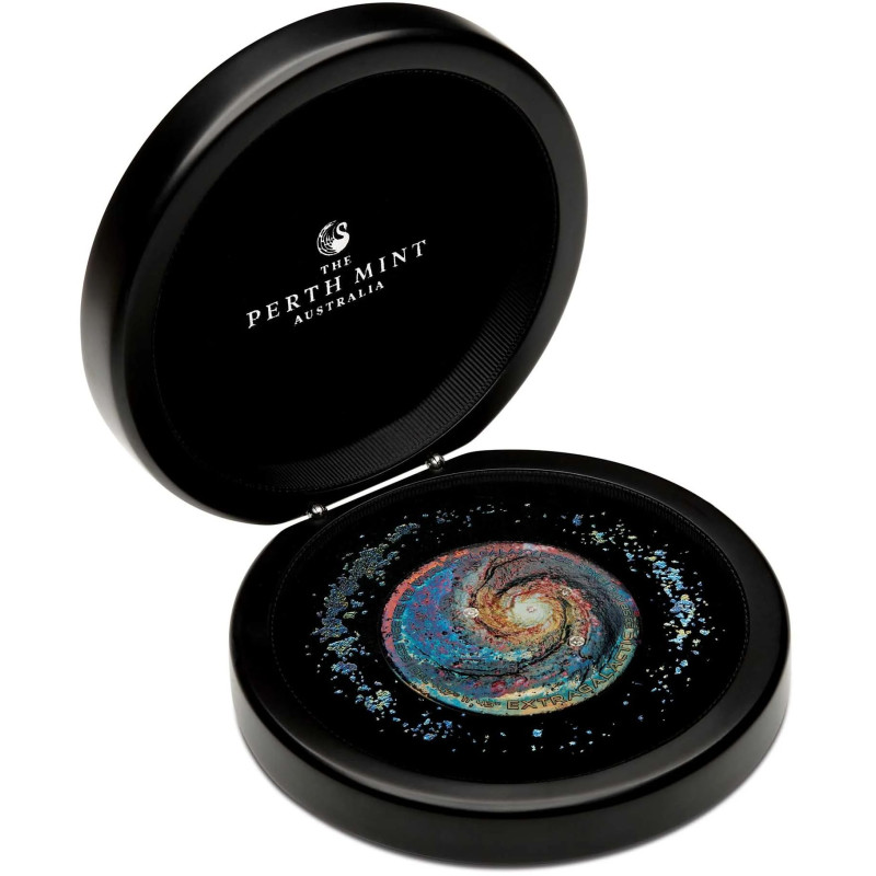 This uniquely patinaed coin portrays a coloured representation of the Whirlpool Galaxy, encircled by the inscriptions ‘EXTRAGALACTIC’, ‘23.58 KPC | 31 MLY’ (its diameter in kiloparsecs and distance from Earth in megalight-years), and its location on the celestial sphere at coordinates ‘RA 13h 29m 53s | Dec +47° 11′ 43’. Representing stars within the Galaxy’s arms, the reverse is hand set with a pink, golden, and two white diamonds. Also included are the designer’s initials ‘NM’, The Perth Mint’s ‘P’ mintmark, and 2025 year-date.