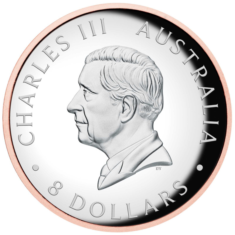 The coin’s reverse portrays a koala clinging to a tree trunk amongst eucalyptus foliage. The koala and the coin’s rim are gilded in 22-carat pink gold. Included on the reverse are the inscriptions ‘KOALA’ and The Perth Mint’s ‘P’ mintmark, as well as the coin’s weight, purity and 2025 year-date.