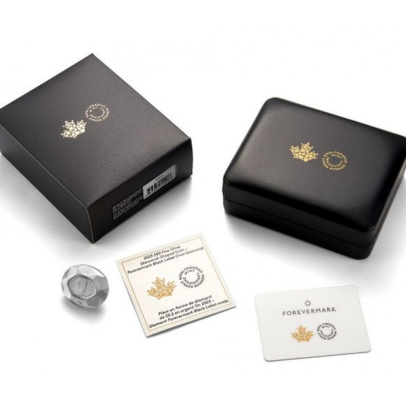 Embedded on one of the coin’s engraved facets, the 0.23-carat Forevermark Black Label Oval Diamond and its complex, patented cut inspired this premium collectible’s multi-dimensional shape and facets.