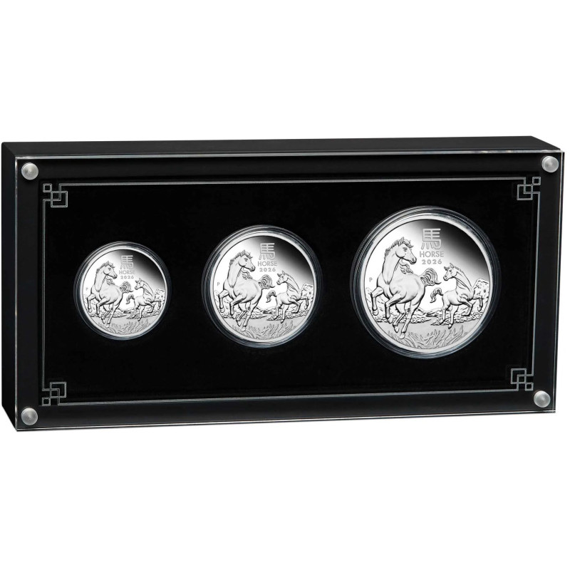 Celebrate the 2026 Year of the Horse with this three-coin set, comprising coins struck from 2oz, 1oz and 1/2oz of 99.99% pure silver in flawless proof quality.