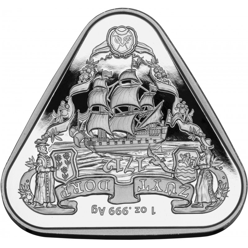 Reverse design: With the image of the ship viewed upright, the Zuytdorp is shown setting sail in its full glory. Flipping the coin to view the text of ‘1712’ and ‘Zuytdorp' upright depicts the ship in its final state capsized shortly after wrecking in 1712.