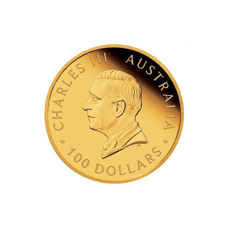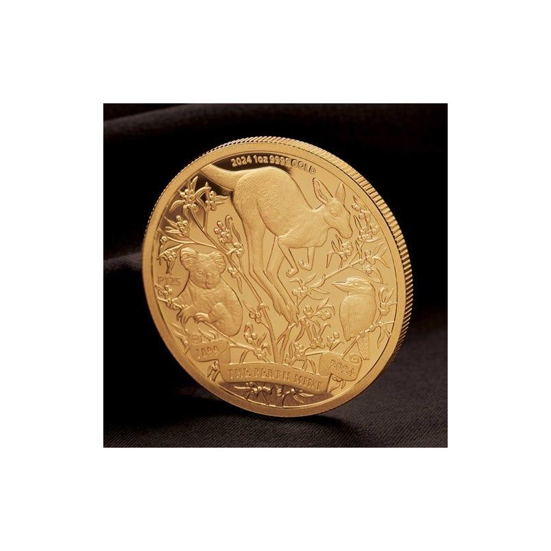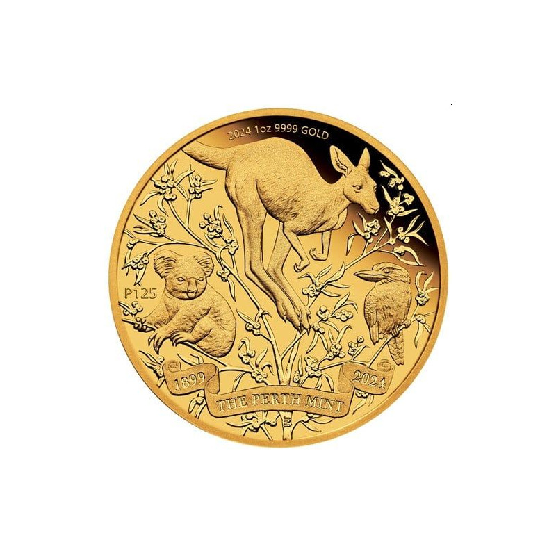 Reflecting its best-known contemporary coin series, the piece portrays a kangaroo, kookaburra, and koala artistically arranged among a representation of golden wattle, Australia’s national floral emblem. The inscription ‘1899 THE PERTH MINT 2024’ appears in a scroll at the foot of the design. Also included are a ‘P125’ mintmark and the coin’s weight, purity, and year-date.